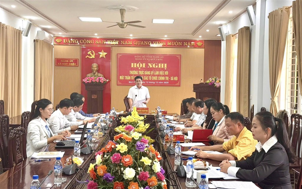 Chiều 12/12/2025, Thường trực Đảng ủy xã Quỳ Châu tổ chức buổi làm việc với Ủy ban MTTQ và các tổ chức chính trị – xã hội để đánh giá kết quả thực hiện nhiệm vụ năm 2025 và định hướng phương hướng, nhiệm vụ năm 2026. Đồng chí Nguyễn Thanh Hoài, Ủy viên Ban Chấp hành Đảng bộ tỉnh, Bí thư Đảng ủy, Chủ tịch HĐND xã chủ trì hội nghị. Tham dự có đồng chí Vi Văn Hanh – Phó Bí thư Thường trực Đảng ủy xã, các đồng chí Thường trực Đảng ủy; lãnh đạo các cơ quan tham mưu, giúp việc; Ban Thường trực Ủy ban MTTQ xã và đại diện các tổ chức chính trị – xã hội.